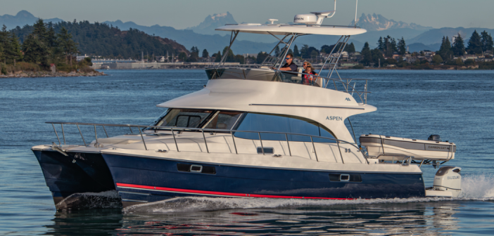 This week at the Annapolis Powerboat Show Washington state builder Aspen Power Cats is introducing their all new 44-foot, C128 outboard-powered cruising cat. The company’s new flagship, with rakish good looks, defines what can be created in a 44-foot, flybridge cat.