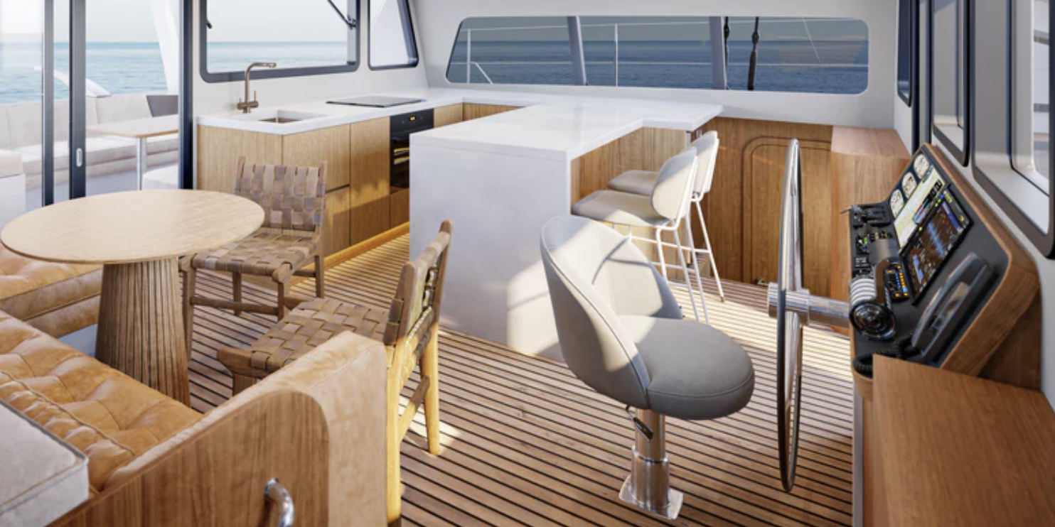 The hull design is fairly conservative and has modest cruising keels instead of dagger boards. This simplifies construction and reduces the risk of getting a deep dagger board damaged. Instead of sail drives, which are common on cats, they have gone with 25kW electric motors with straight shafts.